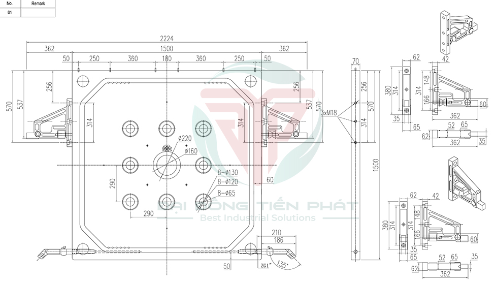Khung bản thường có các kích thước phổ biến như 500x500, 630x630, 800x800… Mỗi kích thước sẽ tương ứng với một bản vẽ khung bản máy ép bùn riêng biệt, phù hợp với công suất và nhu cầu xử lý bùn khác nhau.